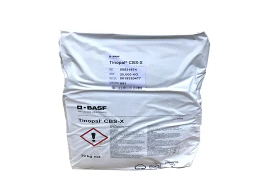 BASF CBS-X is a yellow crystalline powder brightener (content ≥99%) with high whitening efficiency on cellulose fibers. It resists washing, acids/bases, bleach, stabilizes in concentrated detergents, and works at 0.1-0.5% dosage in various detergent production processes.